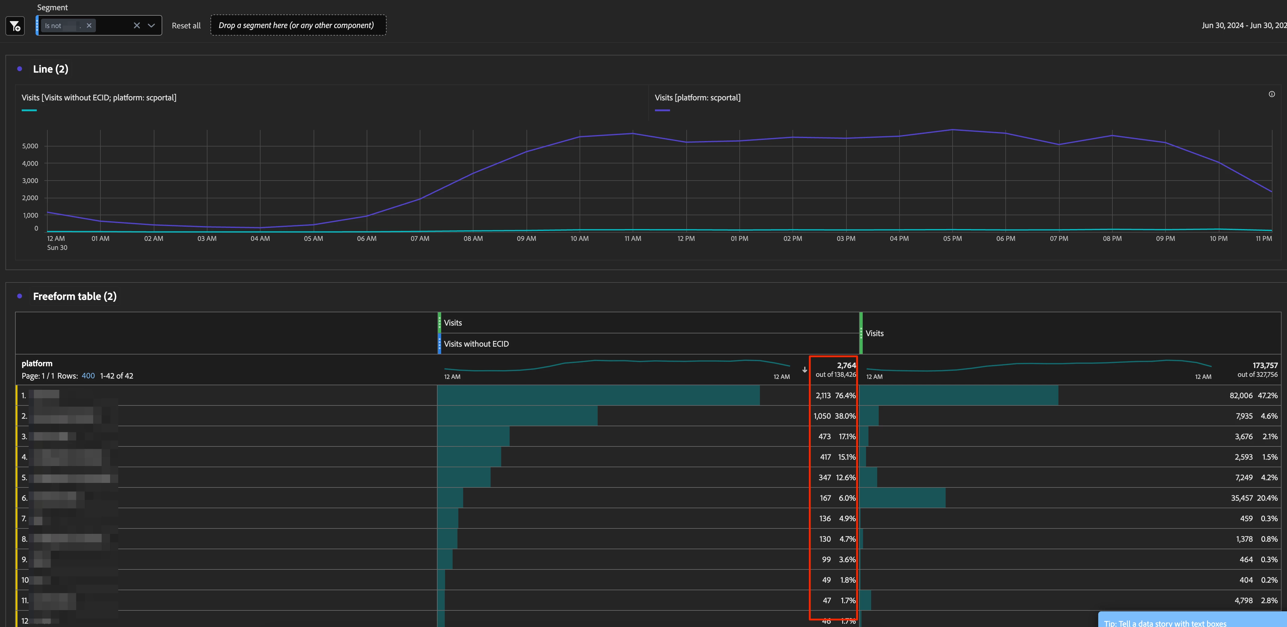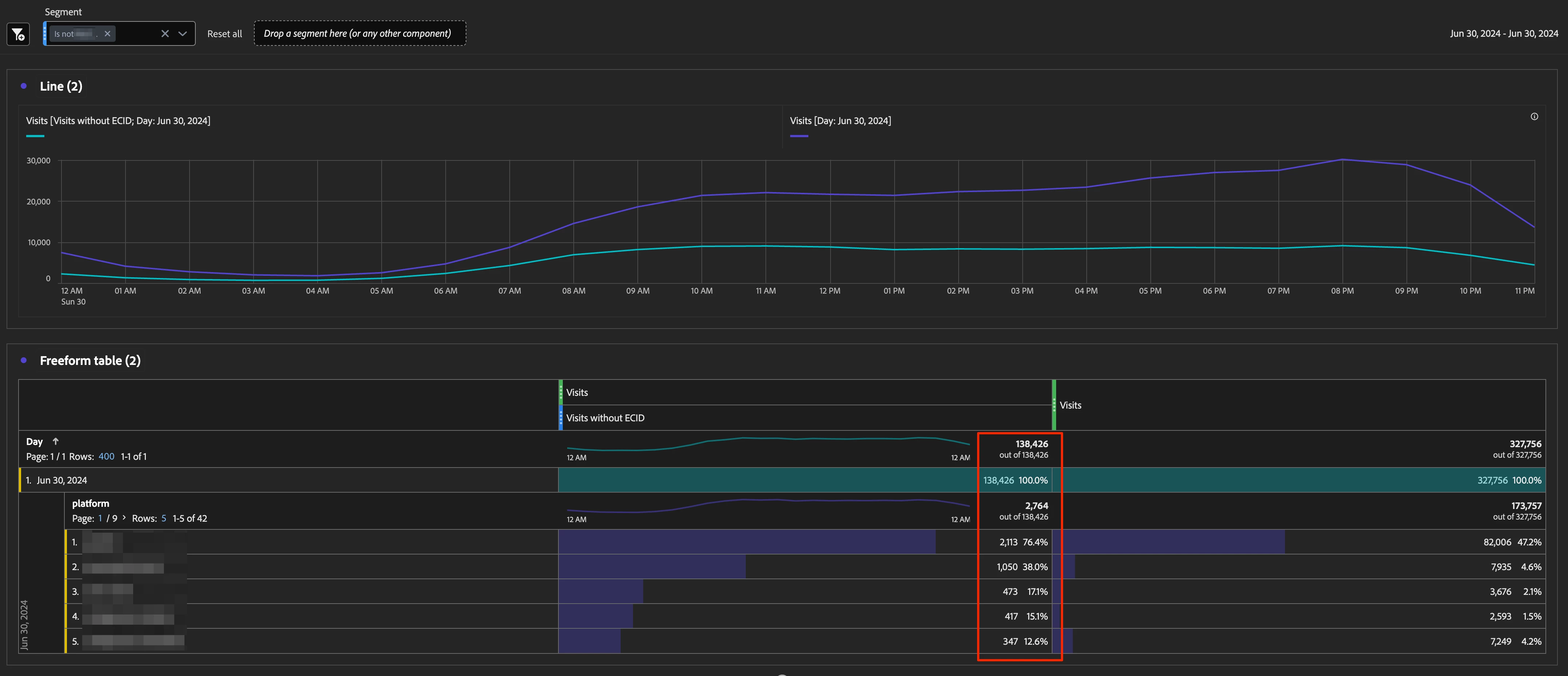• an applied Hit-level segment that filters out a specific value in the prop "Platform"