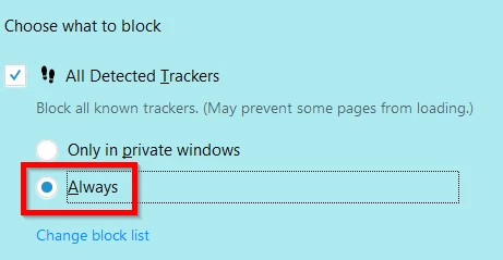 The "All Detected Trackers | Only in private windows" setting will block all tracking and marketing in Private Browsing; e.g., Adobe DTM, Google Tag Manager, Adobe Analytics, Google Analytics, Adobe Target, Facebook