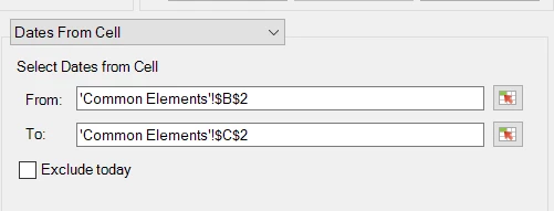 Then I will make a References Sheet (i.e. "Common Elements" - here is where I will use Excel formulas to set my date ranges dynamically (=EOMONTH(TODAY(),-2)+1 and =EOMONTH(TODAY(),-1) to get "last month" for instance) - While I could use the date selector in Request Wizard, this gives me more control without having to edit the requests.