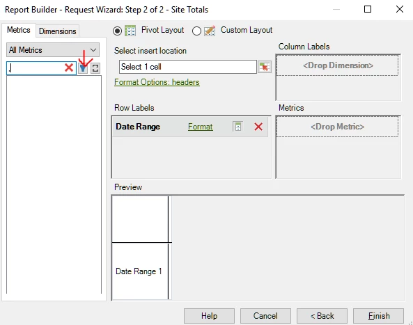 To access the Calculated Metrics created under specific report suite, click on the filter icon for Metrics and then select the Report Suite under which it is created. This will make the same available in the list: