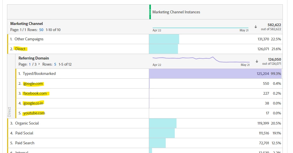 2. When we break down to understand the direct, I can see other domains like Facebook and google. Is it right way to breakdown and if yes why we are getting other domains in Direct channel.