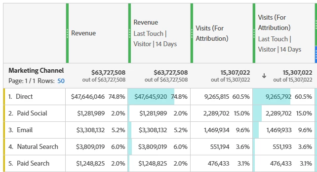 Hey @JayGr, The default ‘Marketing channel’ dimension functions identically to the ‘Last touch channel’ dimension only, so in a way, you are looking at the Last Touch Channel report. Yes, if hit 1 is Affiliate, but hit 3 is Direct, and you have override checked, in the same session channel would be overridden to direct. We can take a more deeper look of your setup and report, if you can log a support ticket to and we can cross validate this with the backend data as well and share more detailed analysis.