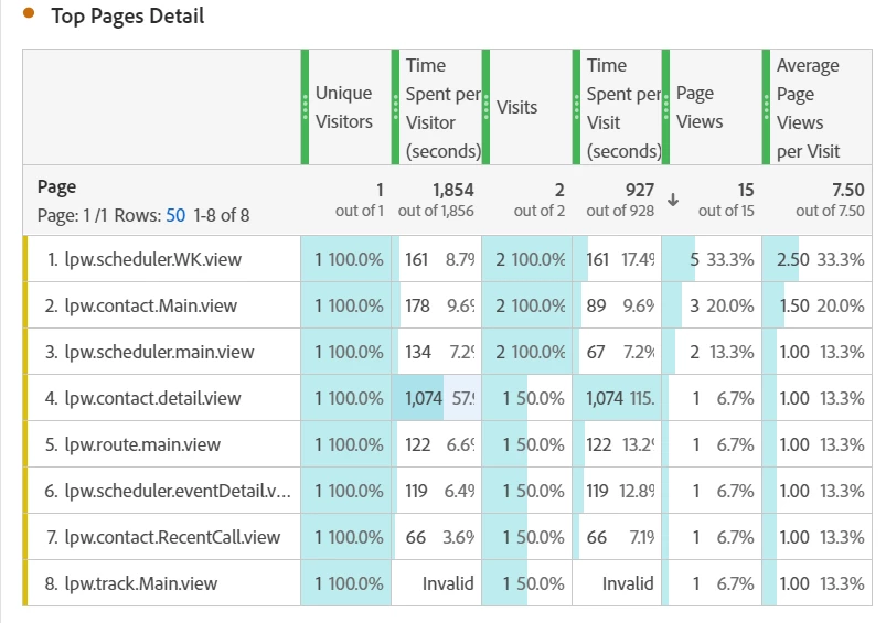AA report shows 1,074 seconds for lpw.contac.detail.view in time spent/visitor & time spent/visit (image 1); however, I only stayed on contact detail view page for about one min only (image 2).
