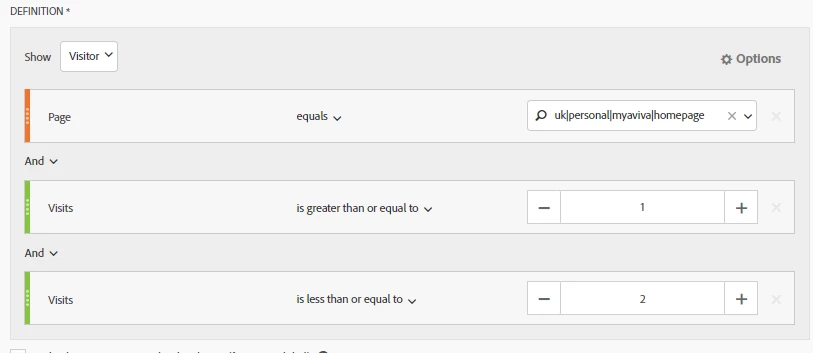 I have created the below segment but i worry that this is just saying they have seen the homepage at least once and have visited our site once or twice, those visits are not specifically tied to that page.