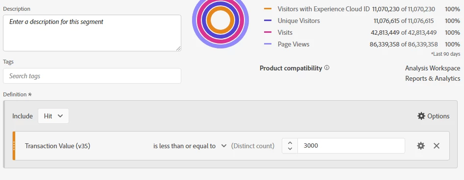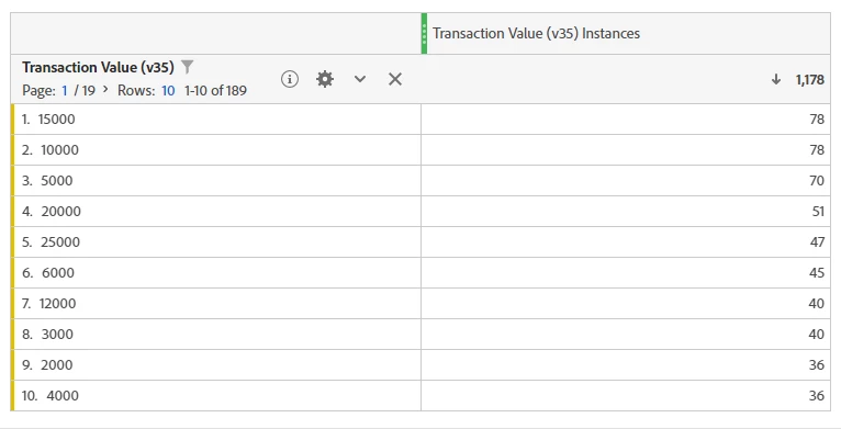 I have another question concerning the tracking of the dimension “Transaction Value” in Adobe Analytics. The dimension items. like “3000” or “10000”, depending on what credit volume a customer requests in his product application for the private credit. These values are captured as discrete values, which means I currently can’t (or just don’t know how to) build segments like this: