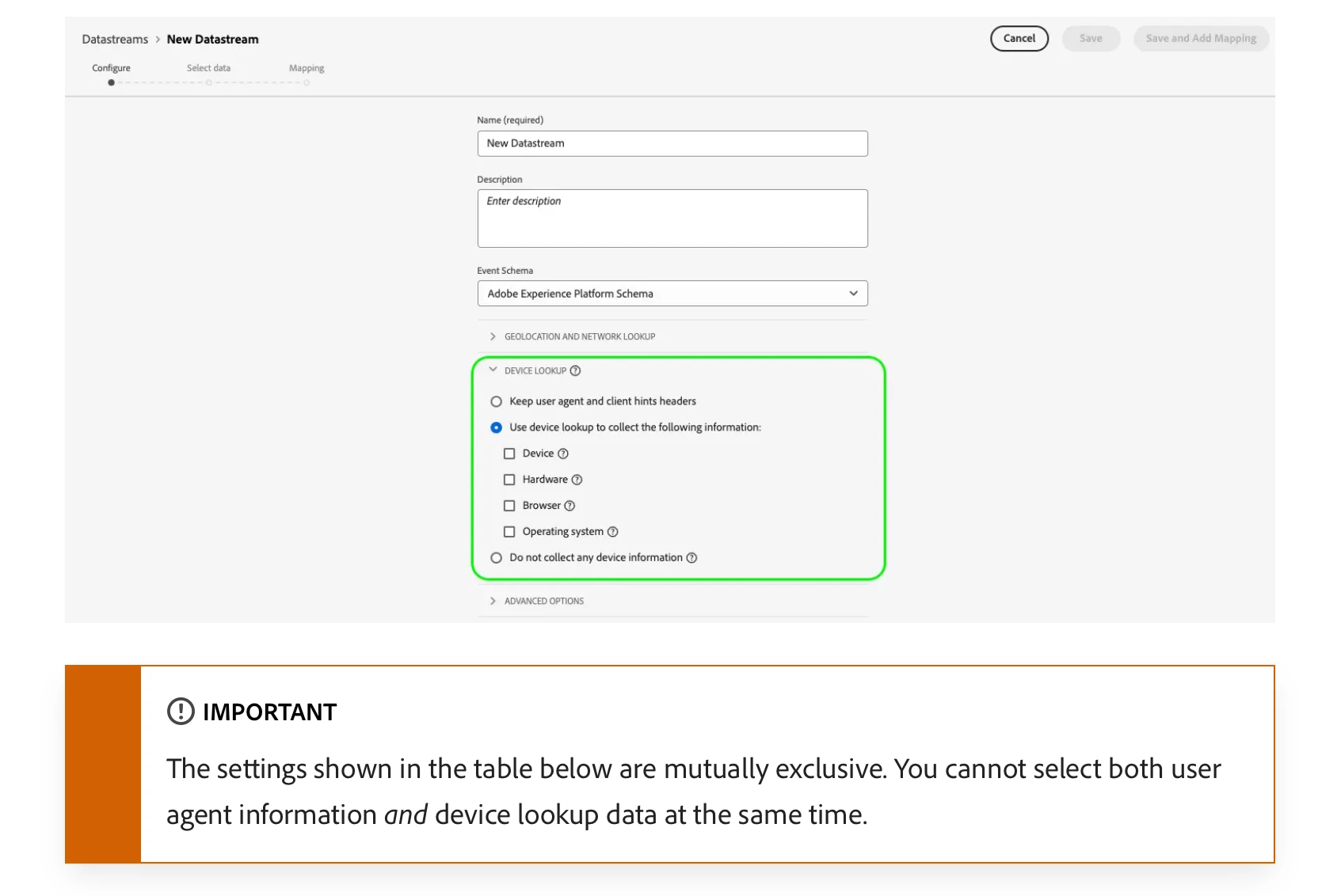 Is this something which will only work if 'Use device to lookup for the following information' is checked and user agent disabled? any extra steps on mapping?