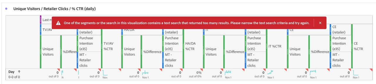 " One of the segments or the search in this visualization contains a text search that returned too many results. Please narrow the text search criteria and try again."