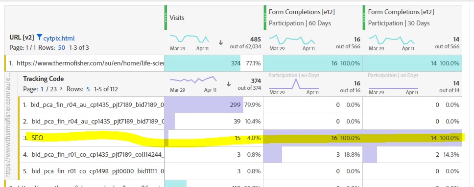 1. Why does SEO has 14 form completions (30 day attribution window) with 15 visits?