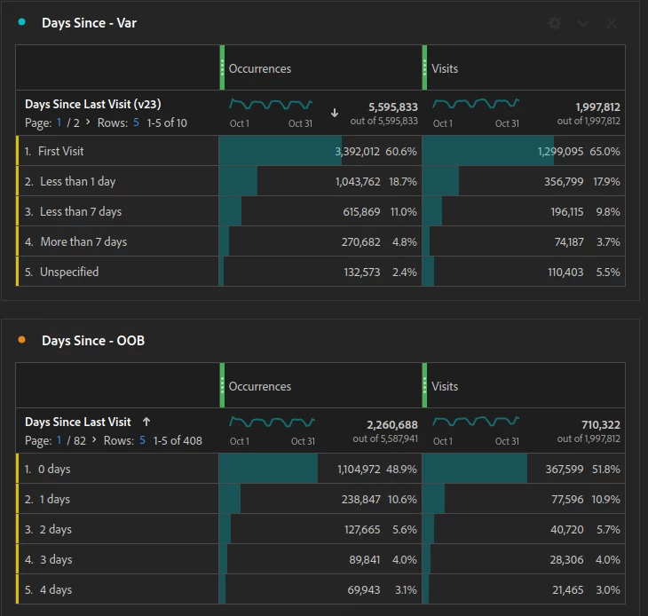I was comparing the OOB "Days Since Visit" dimension to some custom ones we have which serve a similar purpose (set using the Analytics plugin). I noticed there is a very large difference between the overall occurrences and visitors associated with the two.