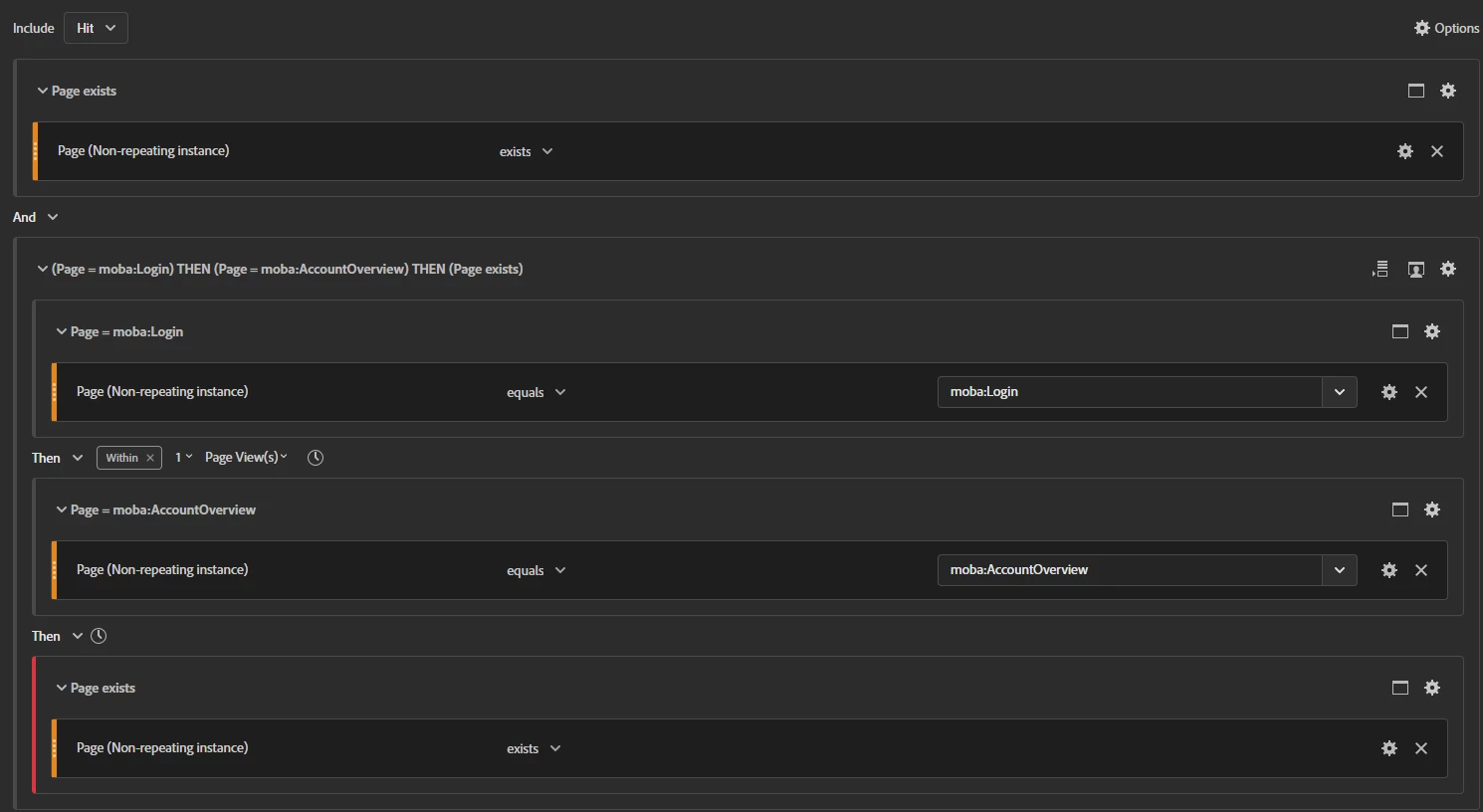 First container is on hit level and the second group is on visit with the option 'Only After sequence'.