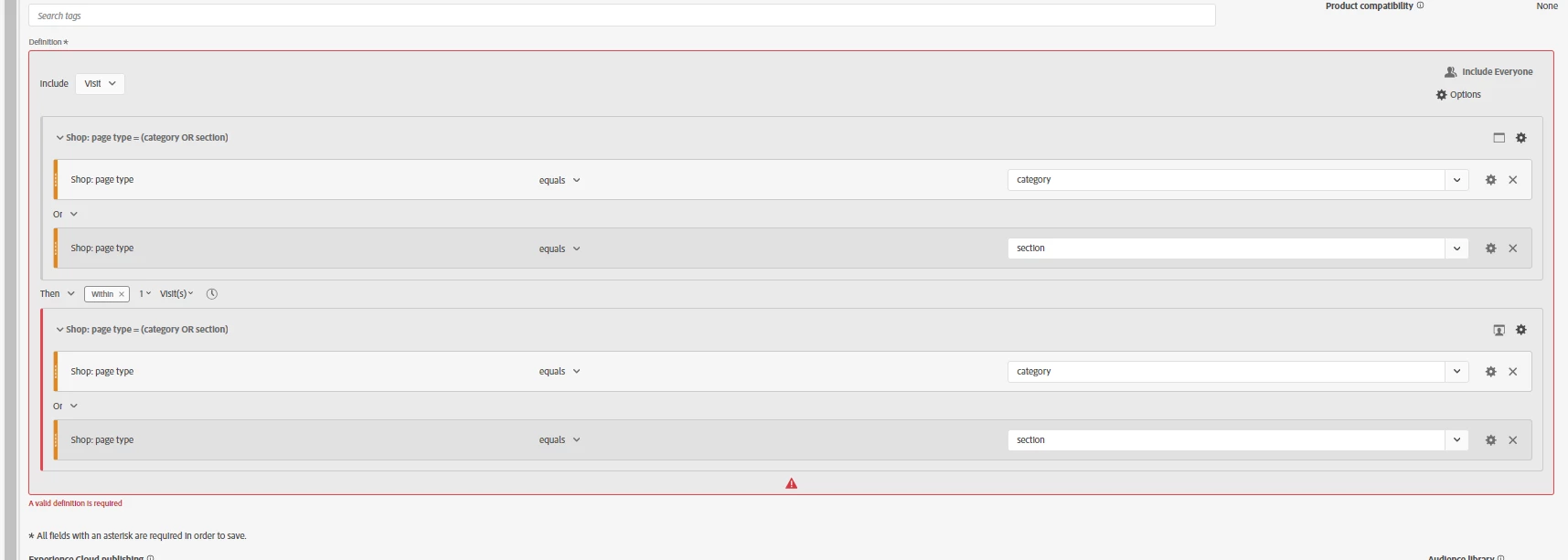 I want to create a segment for users who viewed one of two specific pageTypes in their visit (lets call these pageType A and pageType B). I am currently using a visit level segment that excludes hits where previous pageType = A or B, and another container where pagetype = A or B. When I apply this segment within a flow diagram (with my dimension being pagetype) this still returns pagetype A and B in subsequent hits.
