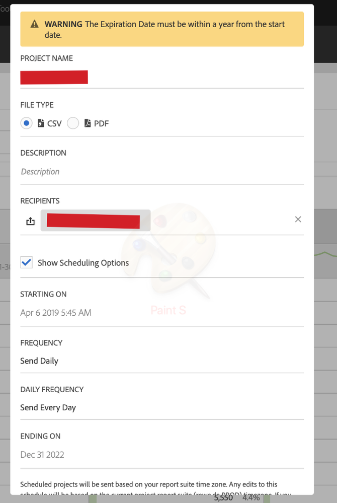 In the documentation it reads: "Scheduled Projects Manager, you can edit and delete recurring project deliveries. You can create delivery schedules that send your reports via email to a specified address. You can configure these schedules to automatically send the reports at specified intervals for a duration of time or indefinitely, or stop the delivery of a recurring project." (Scheduled Projects Manager )