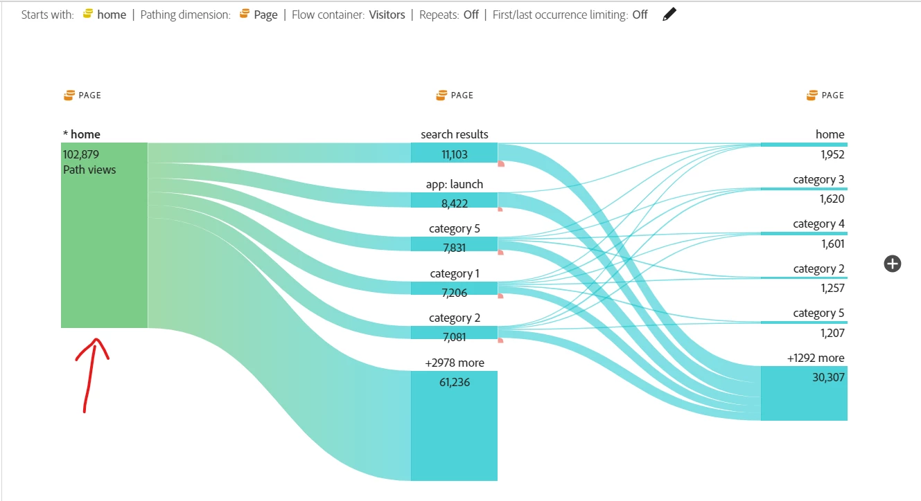 I'm new to adobe analytics, so please bare with me. I was asked to conduct a site path analysis starting from the homepage, which is the landing page on our website. On this home page, there's a call-to-action button which is the "shop now" button. Based on my research, I've realized that i have to use a flow visualization to examine how users flow from our homepage into other pages on our website. I built 2 flow Viz but it didn't answer the question, I will attach my latest Viz. My question is, How do i go about building this, assuming i want my flow to capture all the visits that arrived for the month at the official homepage and how they navigate from there.