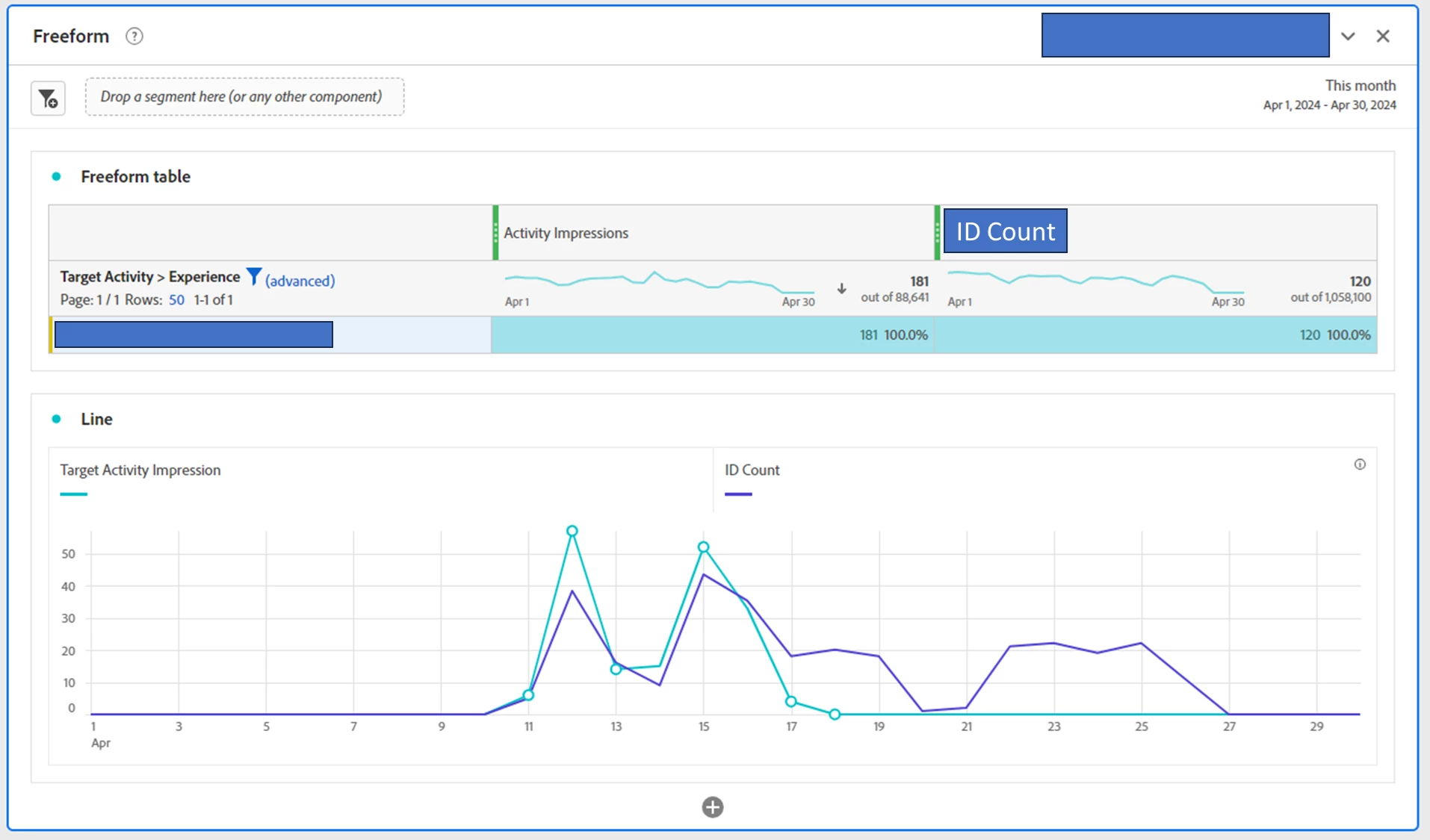 My team launched a new adobe target activity that happened from 4/11 - 4/17. I'm able to see the "Target Activity" and "Experience" show up in dashboards, and when I pull in the "Activity Impressions" metric I can see impressions during that time period.
