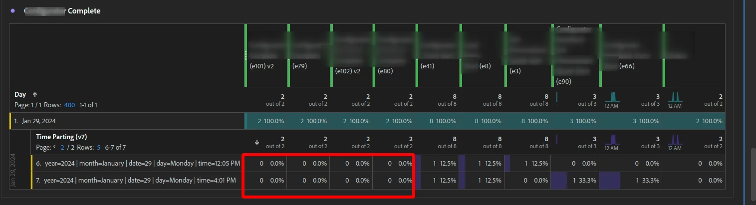 At the moment, it looks like rules for [event 3] and [event41,8,90,61] are showing up correctly in the analytics dashboard. However, the rule for [events 101,102,79,80,purchase] are heavily underreporting