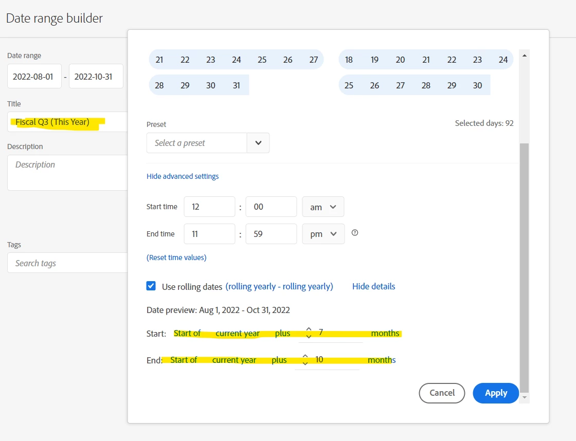 You will probably want to set up 4 such Date Ranges, your custom 4 quarters for this year, and last year (rolling) so that you can re-use these for multiple reports.