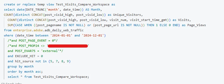 I'm trying to tie out UVs, Visits, and Page Views from Adobe Workspace to Downstream Databricks from the adobe daily web traffic table. Here is my code. I don't know why it's not lining up and I cannot seem to find a good answer. I used the documentation to have certain filters. My page views by month start to fly off, along with visits. UVs seem to be fine though. Can anybody help with this? If not, can someone point me to a Downstream analytics consultant?