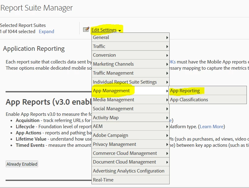 - Click on Edit Settings >> App Management >> App Reporting >> Enable App reports