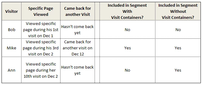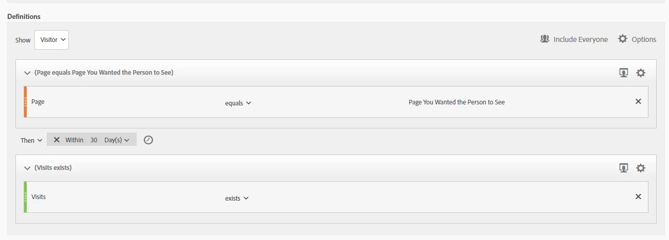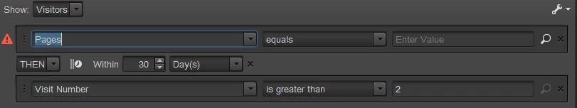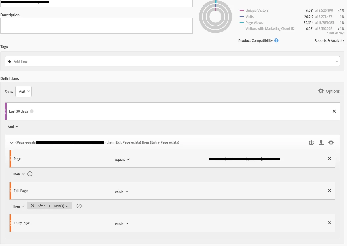I've created the following segment, hoping to see customers who have visited a page in the last 30 days, but who have returned, so that the current visit isn't the one when the page was visited. Basically it's a page that I'd expect customers to return as a result of, and I want to analyse entry pages and opportunities for personalisation.