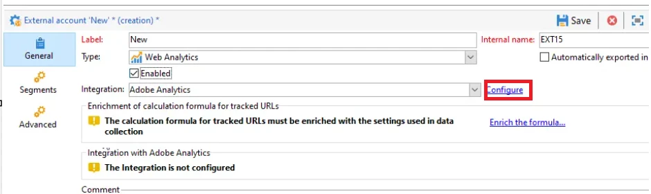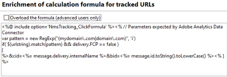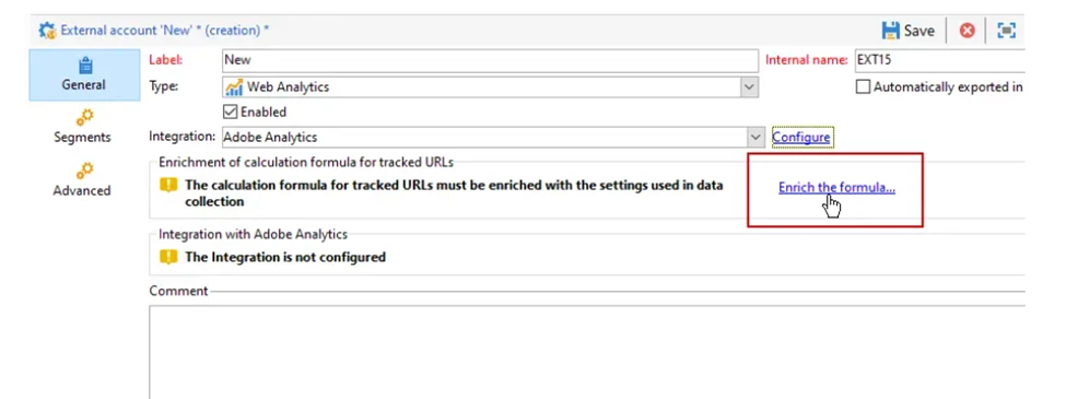 Also, make sure to add all the tracking Url's to whose these parameters to be automatically added when used in the Campaign’s Delivery Templates in the Analytics External account created. Click on “Enrich the Formula” option in the External account as shown below: