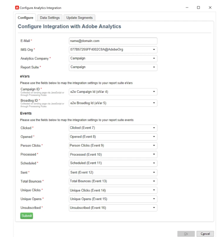 Adobe Campaign can be integrated with Adobe Analytics to send all the utm parameters like no of clicks, no of opens, unique clicks, sent, total bounces, unsubscribes from the attributes and indicator values in the Adobe Campaign Schemas.