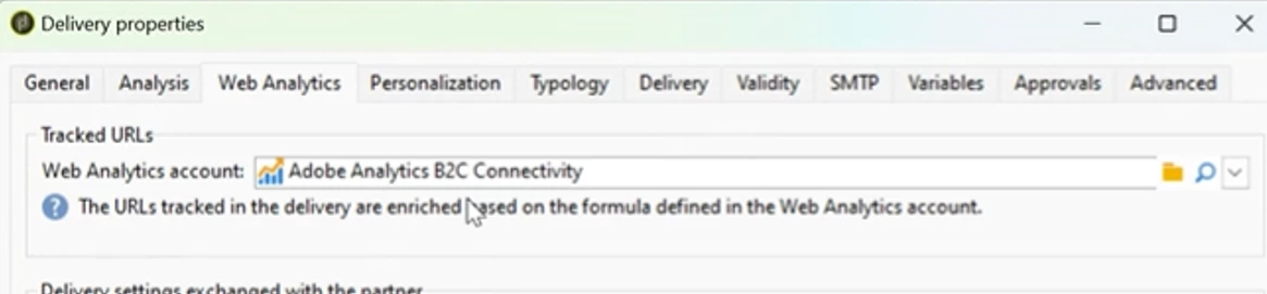 Few useful parameters which are sent to Analytics team in Url parameters are Delivery ID, Delivery Label, broadlogID etc. We need to use the created External account in our delivery Template, by adding it to our delivery properties section as shown below: