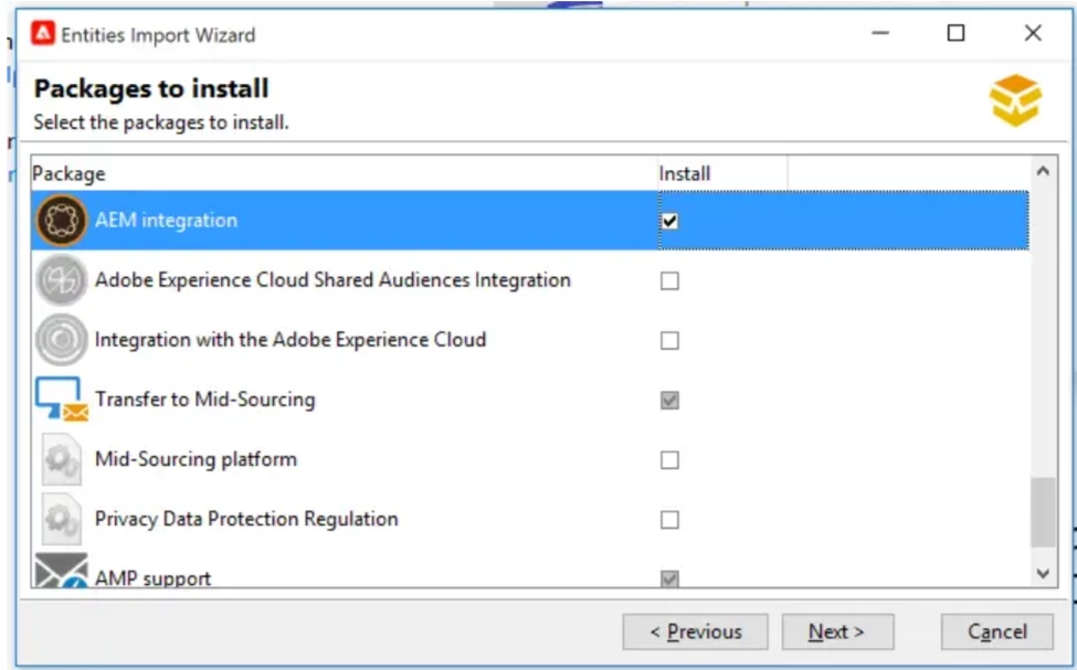 Click Install a standard package and then click Next and select  AEM Integration package.
