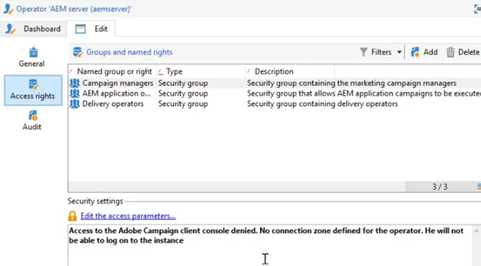 Please go to Administration > Access Management > Operators node and select the Select the aemserver operator. Go to Edit Tab of operator and the “Access Rights” and then click the Edit the access parameters link.