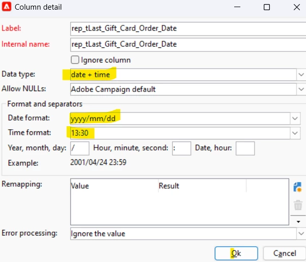 I have issue with Date datatype Column in Adobe campaign classic. Data inserted but with blank values, with below warning for that column.