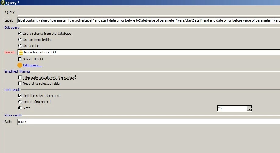 I am defining local variables and then using the query to filter by the defined variables.  Searching by offer label works fine but start or end date throws the following error.