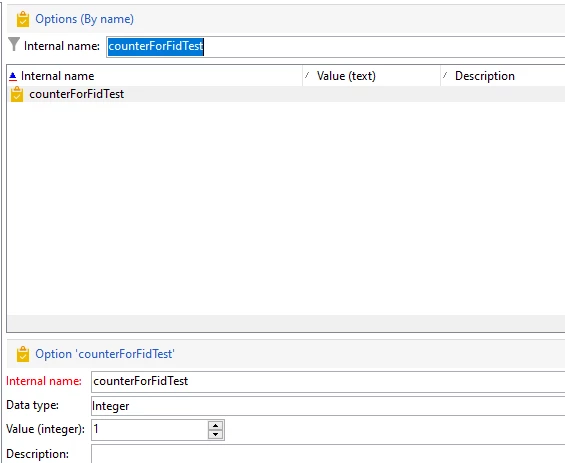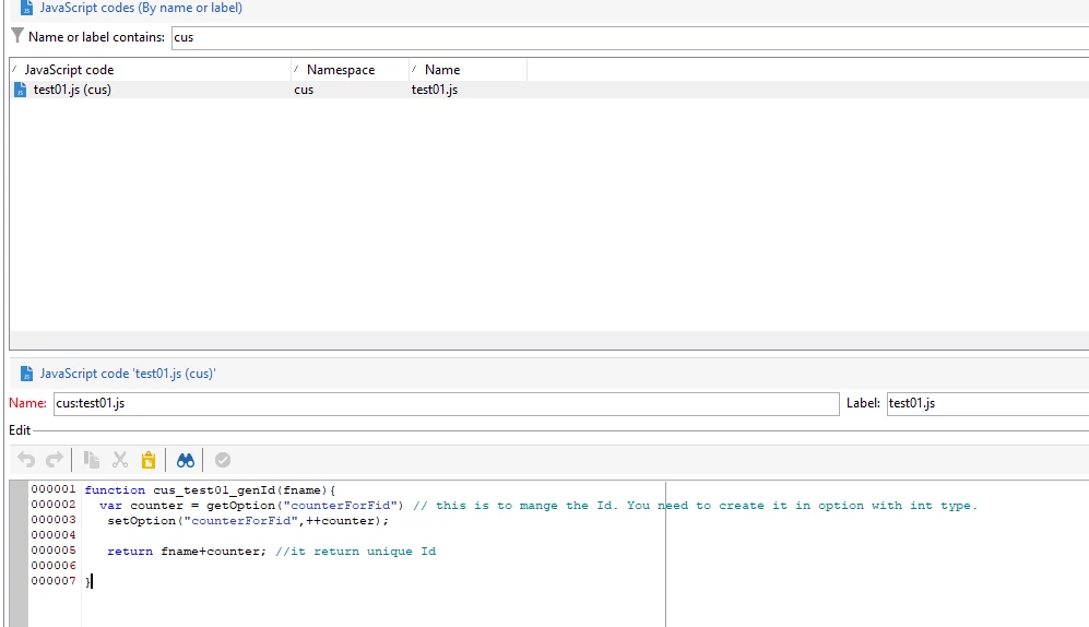 function cus_test01_genId(fname){ var counter = getOption("counterForFid") // this is to mange the Id. You need to create it in option with int type. setOption("counterForFid",++counter); return fname+counter; //it return unique Id }
