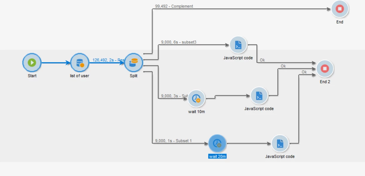 I am making an API call to users using querydef inside the JS activity of workflow. Since Querydef can handle 10k records at a time, we split the entire records into 9k each and used multiple javascripts as show below. We created one JS activity and copy pasted the same for the other two. I am using 'logInfo' inside the JS activity to print the users the the API call has been made.