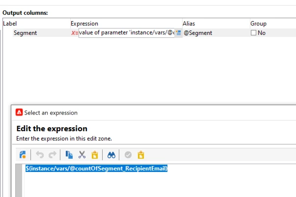 2nd JS Activity : <node expr={"+instance.vars.RecipientEmail+"} alias="@Segment"/> -