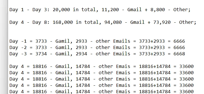 Day 4 - Day 8: send 33.6k each day --> 18.8k Gmail and 14.7k  other