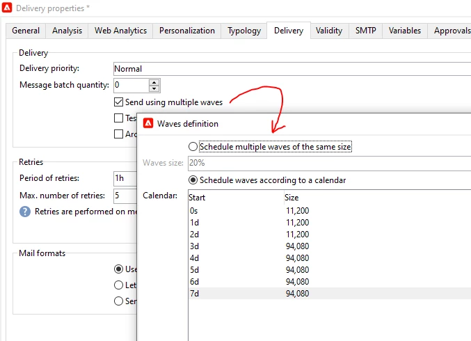 In Gmail's Delivery > Property > Delivery tab > Enable 'Send using multiple waves' > and configure as below,