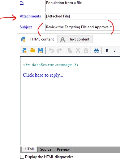 If your use case is to send target recipient counts and other details in a file (generated in Data extraction activity) to the operator, by default in approval activity we don't have an option to add an attachment.