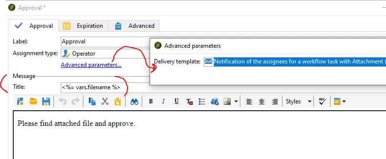 Open Approval activity, Advanced parameters > change the delivery template to above created delivery template 'Notification of the assignees for a workflow task with Attachment'
