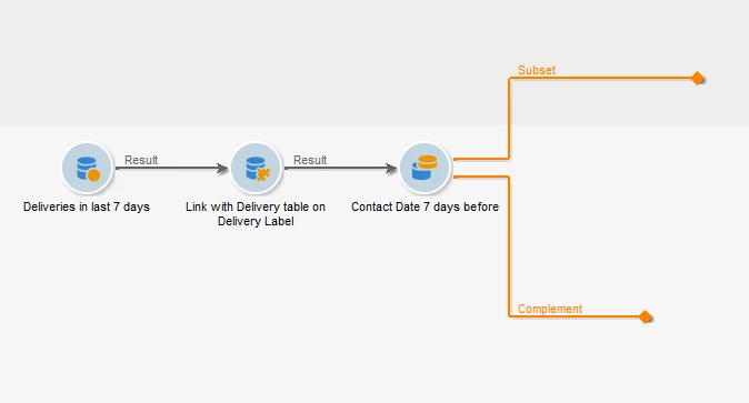 For the past 7 days deliveries, create a link with Delivery table itself on Delivery Label. In the link properties pick the deliveries created before 7 days. In the next split you can check if the linked Delivery exists. If it isn't, (complement) that will give you deliveries first ran in last 7 days.