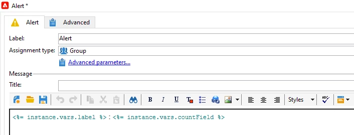 I am trying to include the values of a temporal schema of a workflow in an alert node according to the following Adobe link but it is not working.