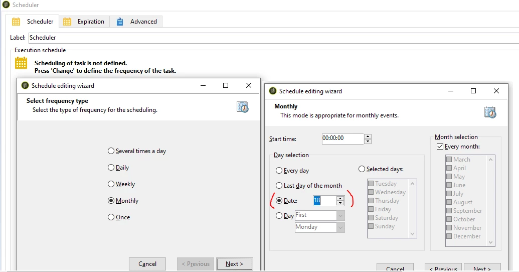 Configure the scheduler to Run on every 18th of the month as per below screenshot,