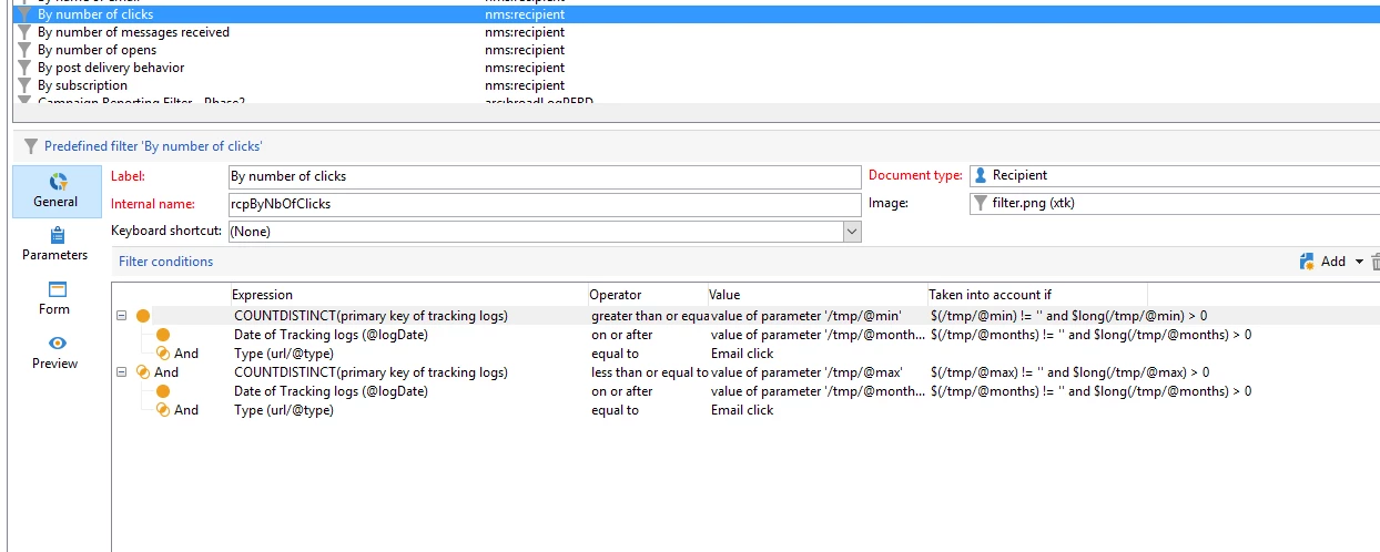 - Having a predefined filter that get all the recipients having an AVERAGE CLICK RATE > #INPUT_VALUE1