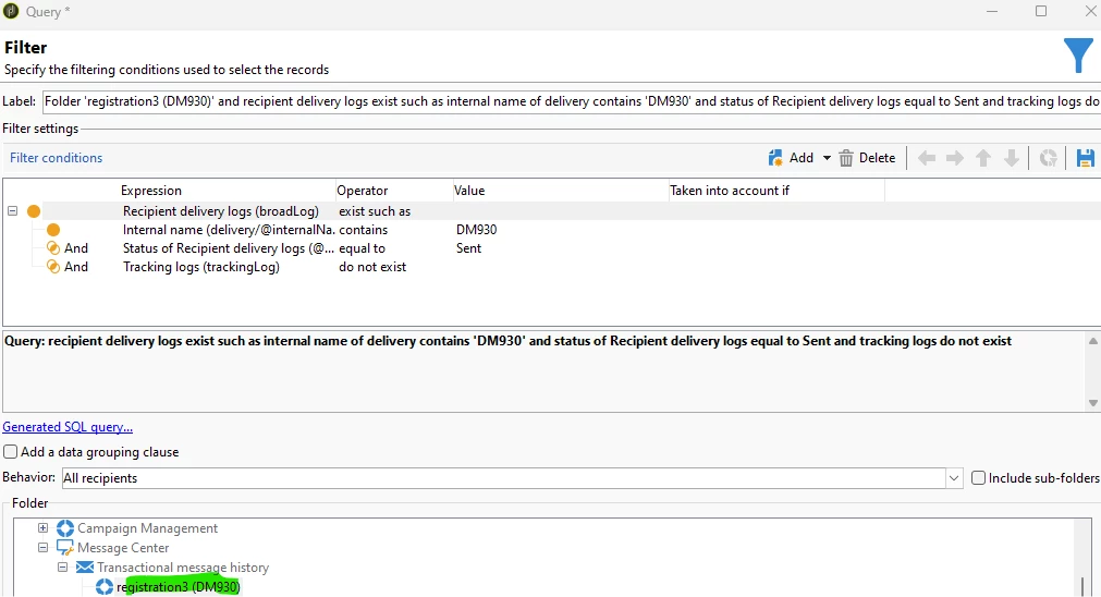 I want to create a query with the following conditions: all users who have received the transactional message "registration3" but did not open it.