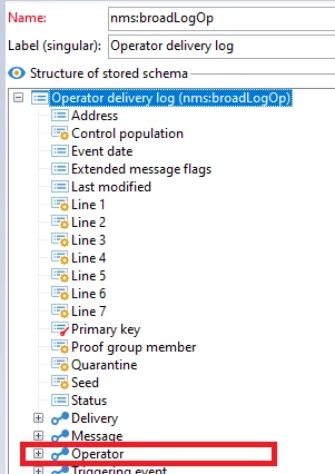Operator delivery log (broadLogOp) Schema is similar to broadLogRcp table, but it is linked with operator schema instead of Recipient schema.