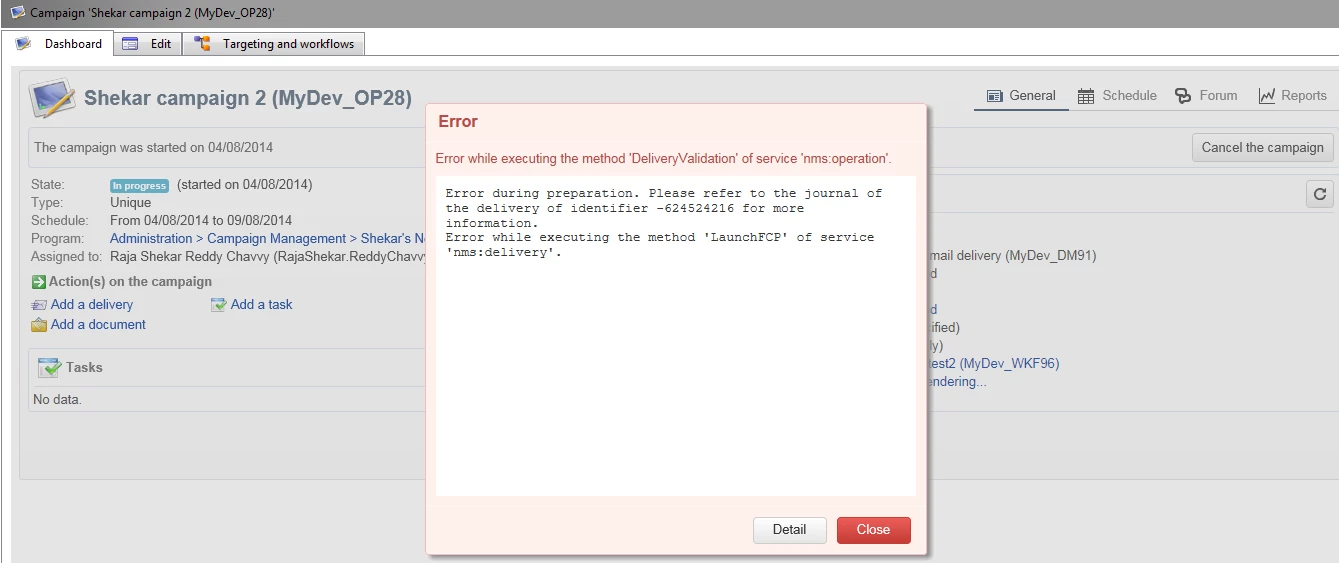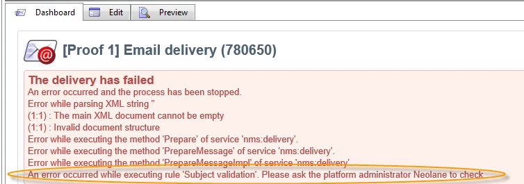 Generally, don't delete campaign configurations. For some configurations, when you delete them they are moved to an archive folder. For example, if I look in the Deleted deliveries folder, I can see some proofs and e-mails that you deleted. The reason your proof failed appears to be because of a missing subject line. There is a rule in Adobe Campaign that checks for this.