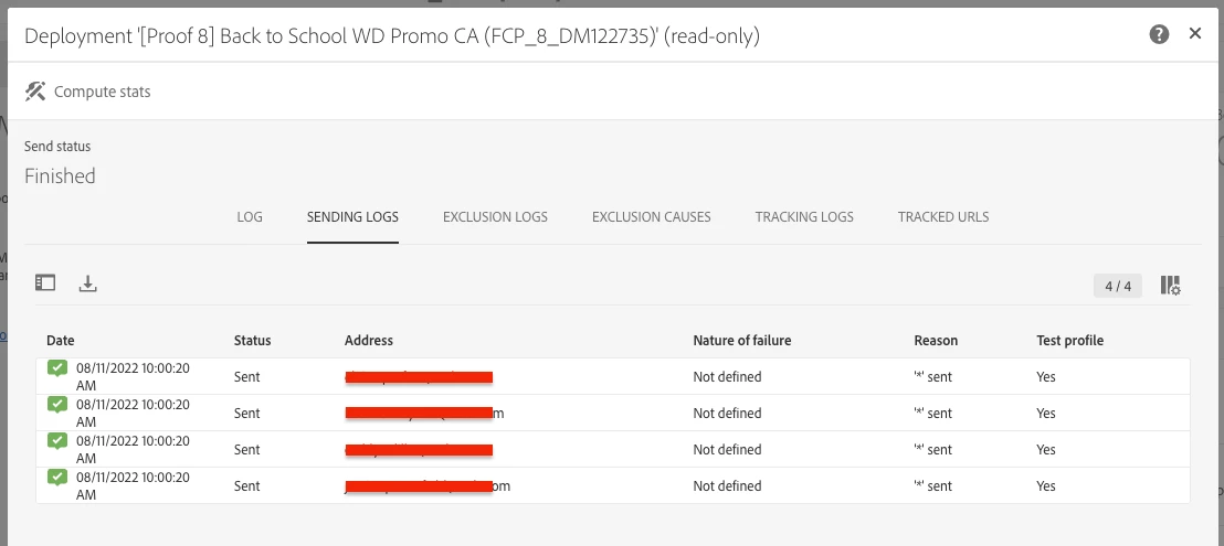 I am using Adobe Campaign Standard. I sent proofs to my test profiles & didnt receive them. The system shows sent & doesnt show issues with delivery. I sent the proofs 8 times over a period of time. I only received proof 3 & 4 out of all of them. System shows sent & green for all. See attached. Anyone have guidance on how to proceed or where to look to further trouble shoot the issue?