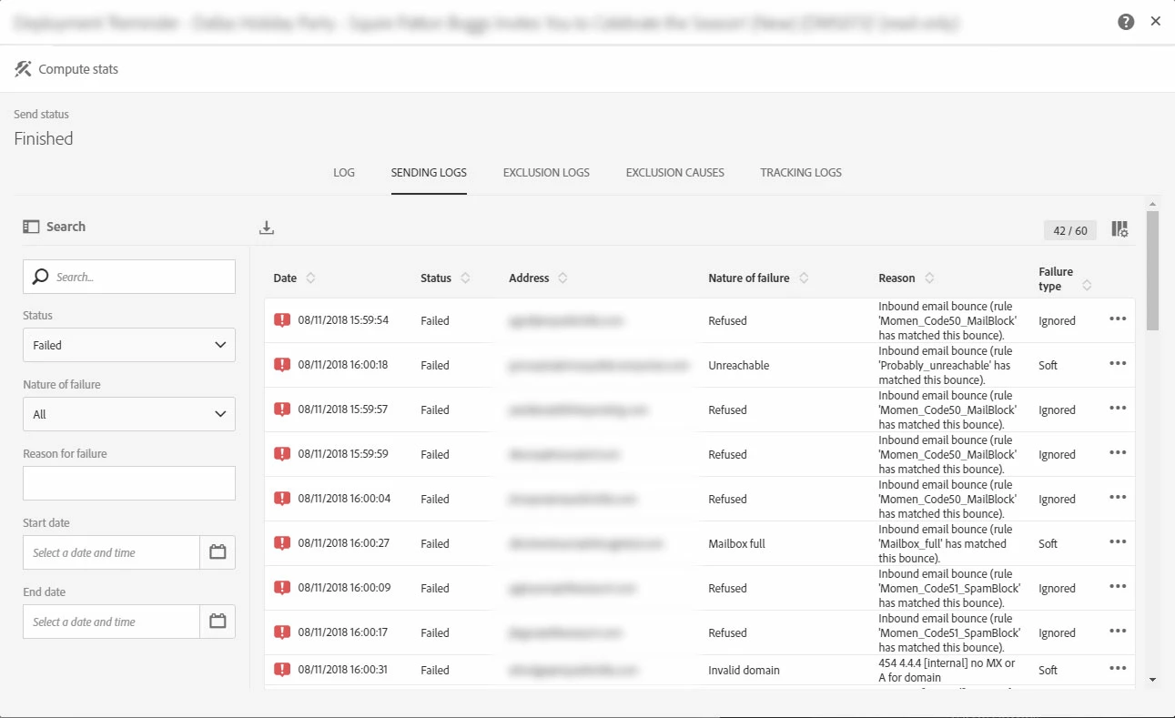 After looking at the sending logs for said mailing, if you filter by 'Failed' it only displays 60 results, yet when you load more to view the full list this only displays 42 of the 60.
