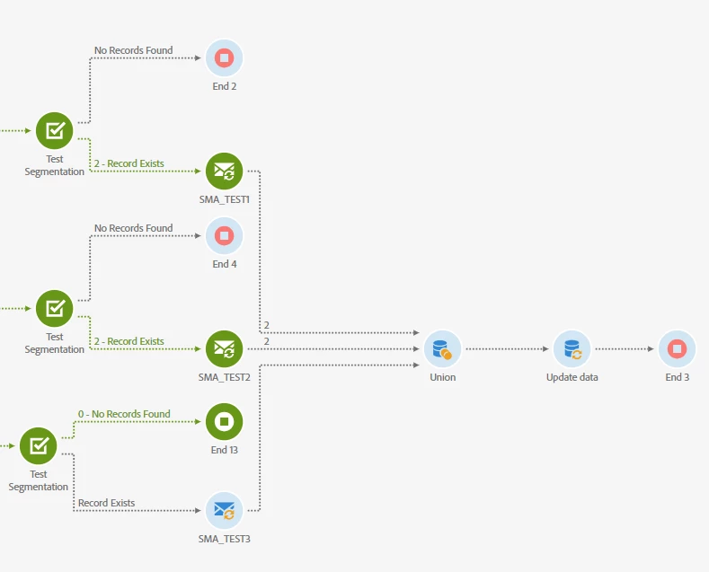 The issue here is that, if Union activity doesn't receive records from all inbound transitions it won't execute (it's like it keeps waiting for records from the empty inbound transition). And in my case, there're many times where I don't send specific emails (SMA_TEST3) and I want to use the Union for the others which sent emails (SMA_TEST1 and SMA_TEST2)