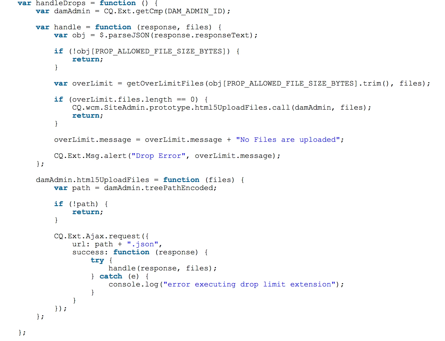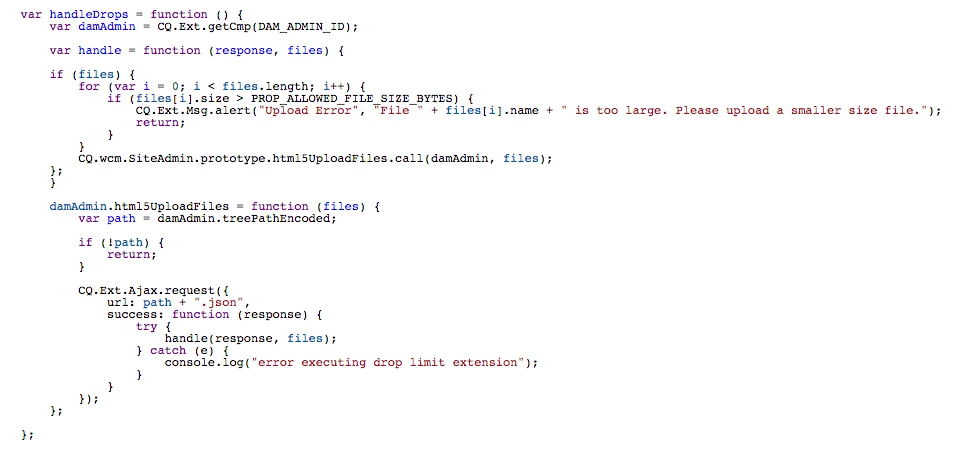 I am following the solution recommended by Experience AEM (Experiencing Adobe Experience Manager - Day CQ: AEM 6 SP1 - Classic UI Restrict Large or Small Files Upload ) to limit file upload size to the DAM in Classic UI. It works as described when authors use the new button to upload asset, however after deploying this code disables the drag-and-drop functionality in the DAM. I tested in new AEM install to make sure issue wasn't related to my code base. Does anyone know why and have any recommended solutions? Thank you.