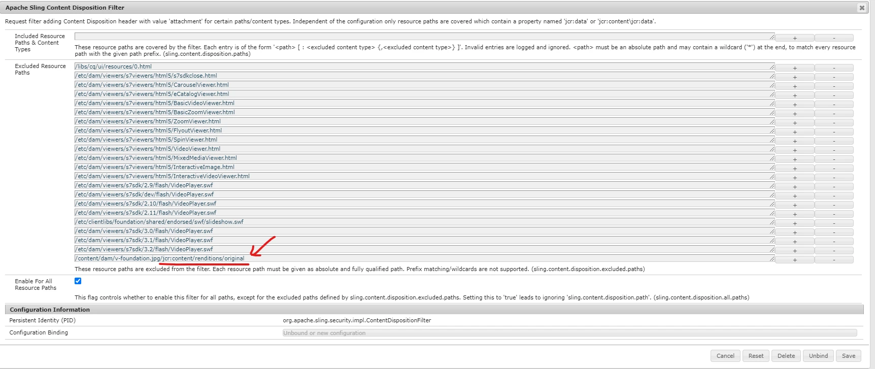 When I open the link below, the image download automatically. I wanted to prevent the image from downloading and wanted it to load on the browser, so I unchecked the checkbox in Apache Sling Content  Disposition Filter for the field Enable For All Resource Paths. But even if I add content/*:image/jpg to Included Resource Paths & Content Types, the image still gets downloaded. I also tried by adding the absolute image path to Excluded Resource Paths, the image still gets downloaded. How can I prevent it?