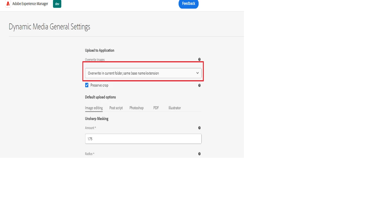 - Ensure that Overwrite image property is set to Overwrite in current folder, same base name/extension. This would ensure that in the business process like above, DM would overwrite the asset only if the folder of the old and new asset remains the same. If folder of old and new asset is not the same, it would create duplicate asset in DM with nomenclature as <Assetname>-1